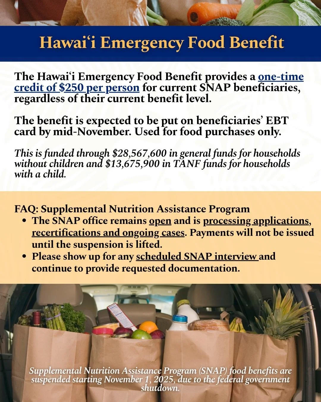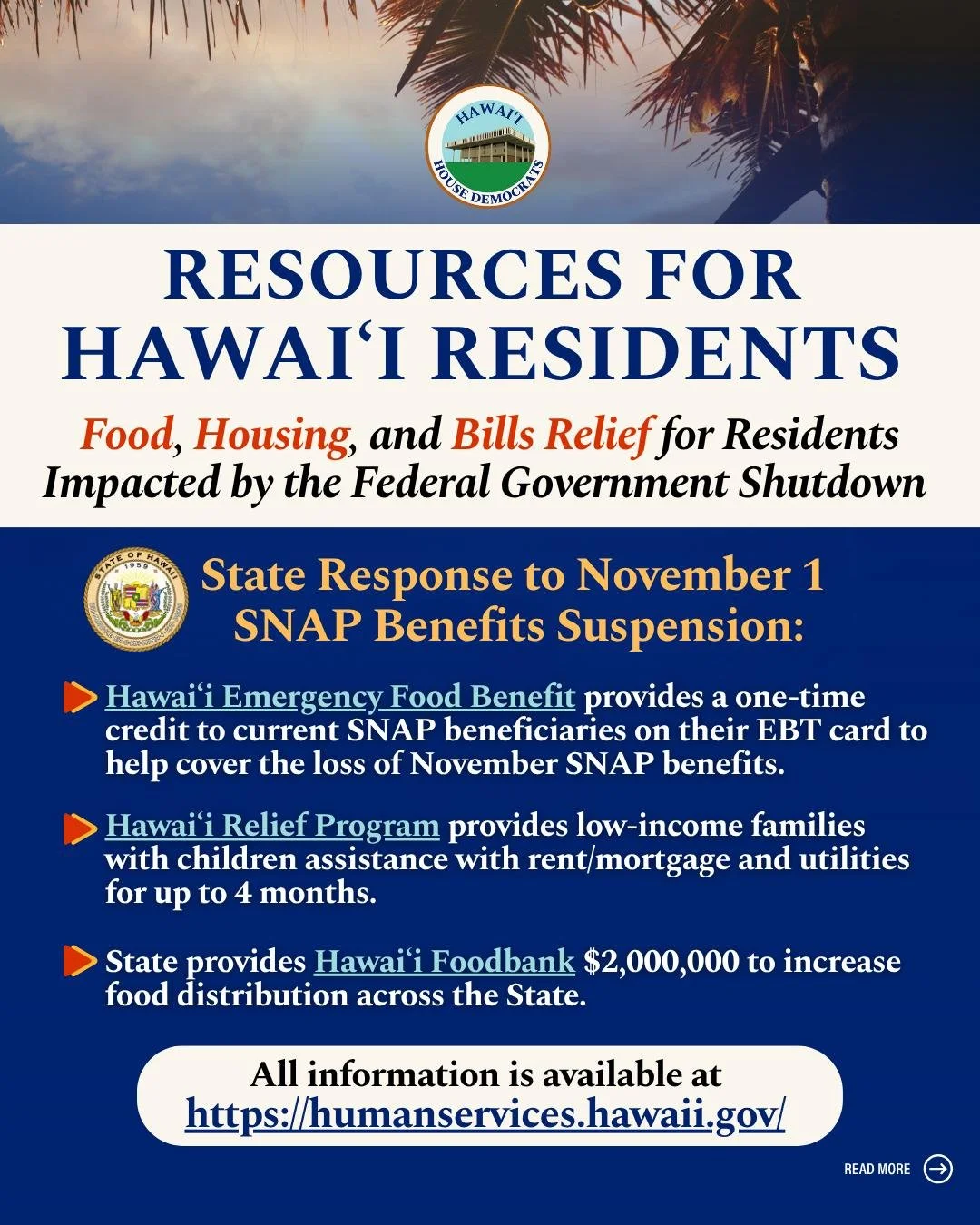 Hawai’i Gov. Josh Green has stepped in to address the possibility that EBT recipients are assured they will receive their November benefits (perhaps a bit late), and coverage will continue into December if needed. Gov. Green has also worked with his departments to set up funding opportunities for rent and utilities and has re-opened the application process for healthcare (aka ACA - also known as Obamacare).